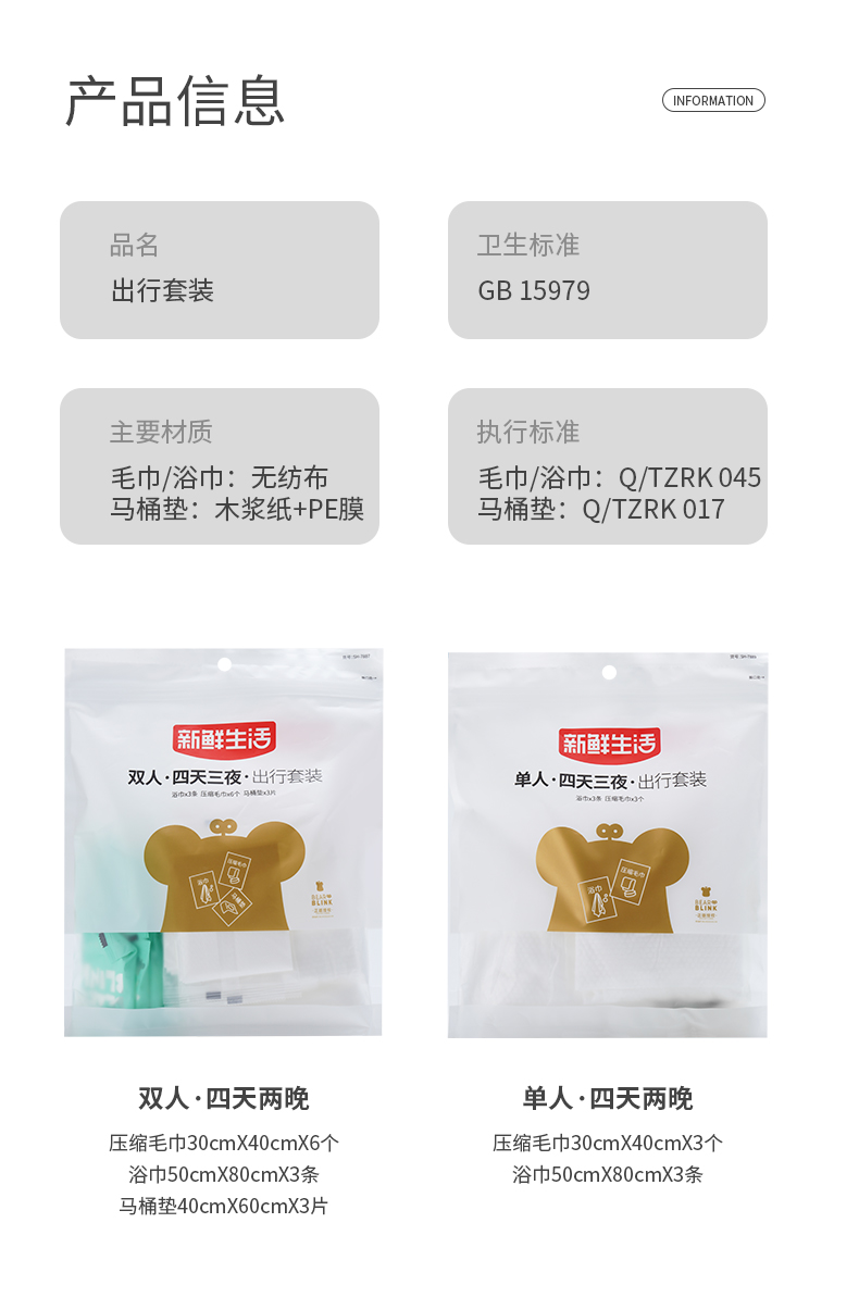 执行标准:GB/T 15979 规格:压缩毛巾30cm*40cm*3个 浴巾50cm*80cm*3条 材质:无纺布 保质期:四年