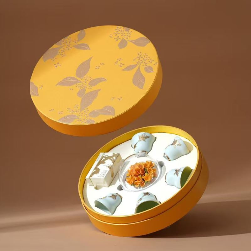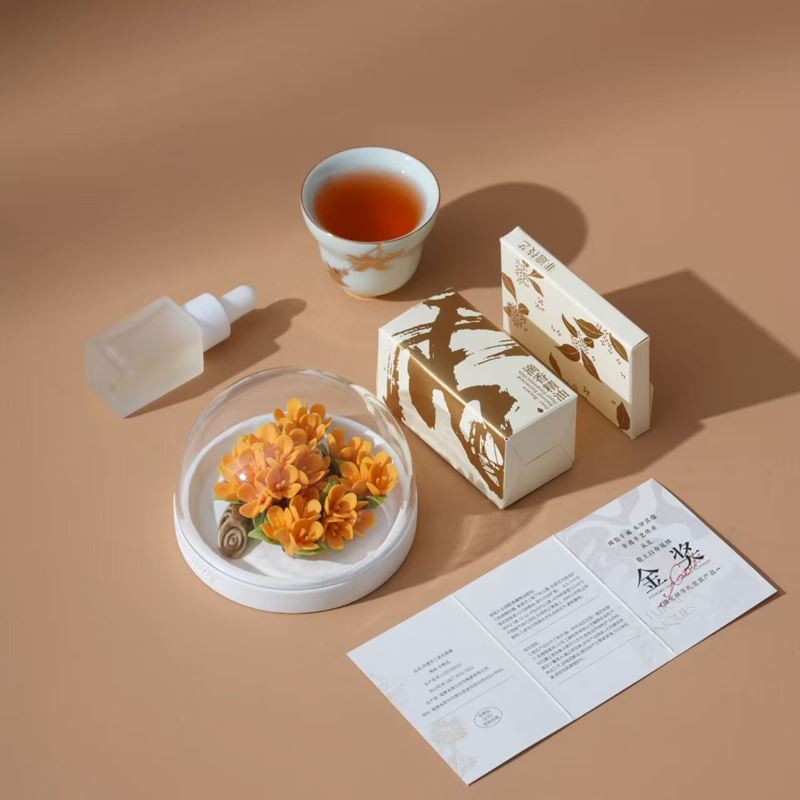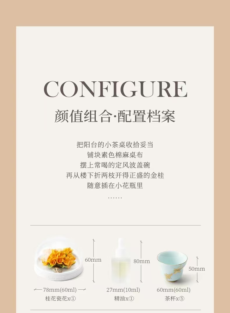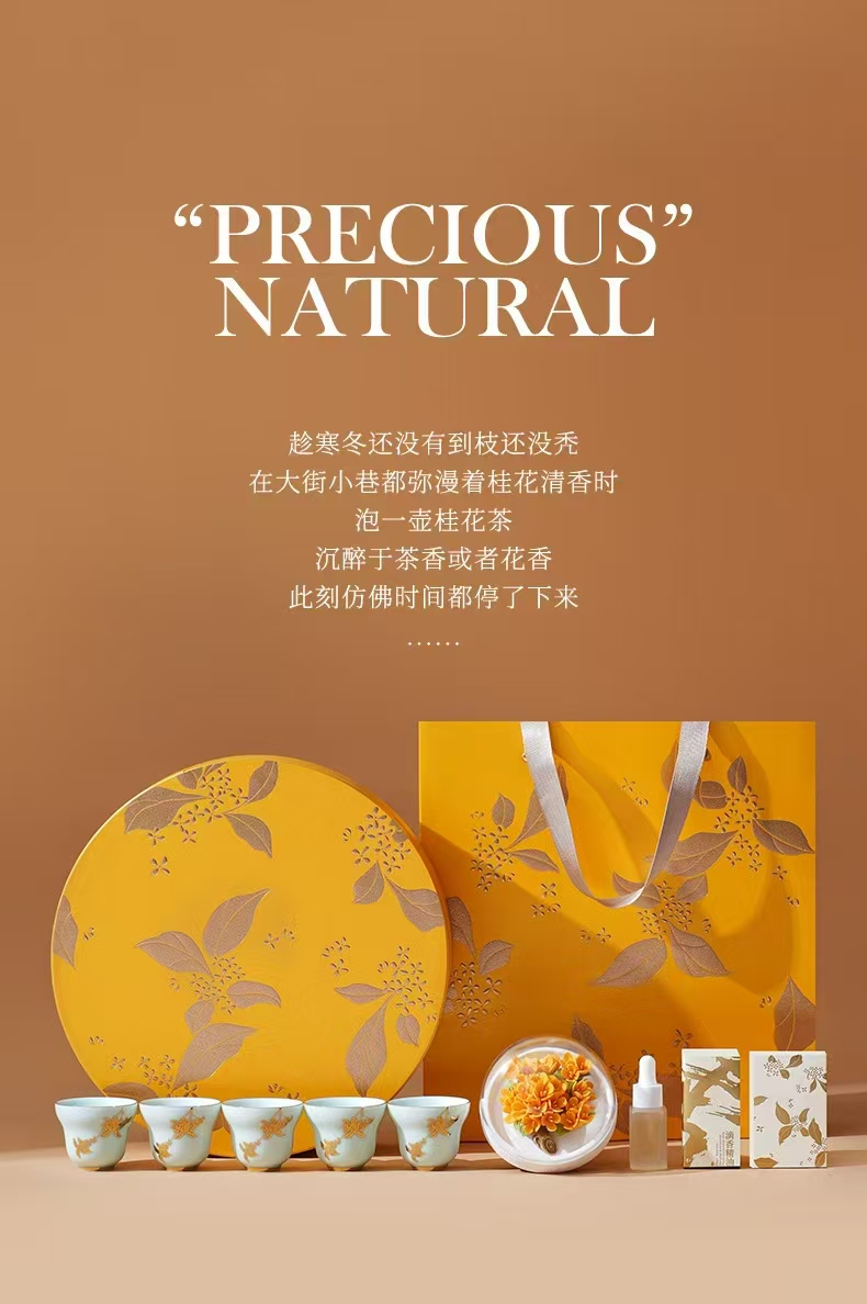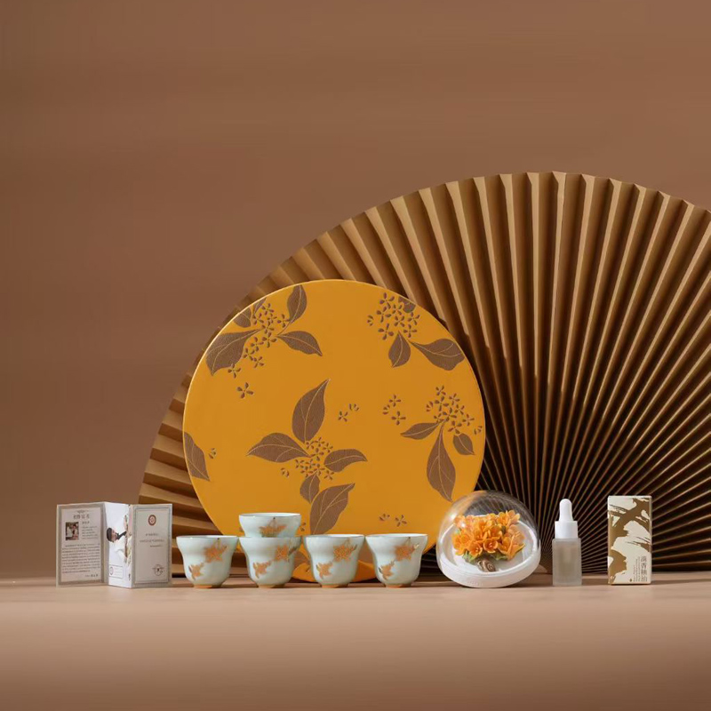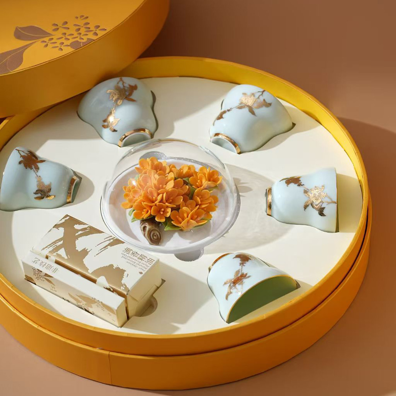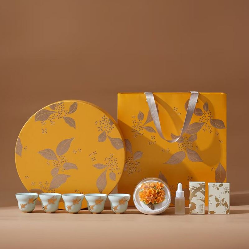 配制:1桂花瓷雕 5杯 1滴香精油 1证书圆形礼盒 手提袋 规格:桂花瓷雕7.8*6cm 精油 7.8*2.7cm 杯子6*5cm 材质:24K真金 高白瓷 瓷雕 精油 推荐说明:桂花瓷雕香满天。 非物质文化遗产,金奖产品。 精致瓷雕桂花摆件,大师手雕,栩栩如生,手工上釉。 杯子描24K真金,尽显奢华。配滴香精油一瓶。证书一份。
