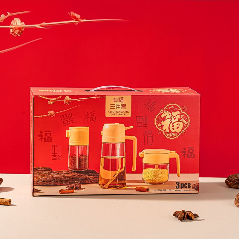 货号:A-YF/L3 有福三件套 规格:16套 组合:油壶*1(450ml)调味*1(330ml)调味瓶*1(190ml) 产品卖点:有福三件套,科学容量组合,贴心搭配,一站式备齐,下厨更省心!满足中式烹饪对油、酱油、醋等不同液体的分类存储需求。一套搞定厨房核心调味品,告别杂乱,让灶台井井有条,无论是新居入伙、节日赠礼还是日常升级,都是体面实用的品质之选. 彩盒尺寸:32*11*18.5CM 外箱尺寸:64X45.4X39CM 重量:14KG