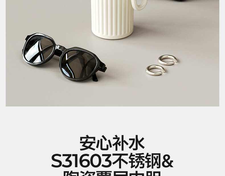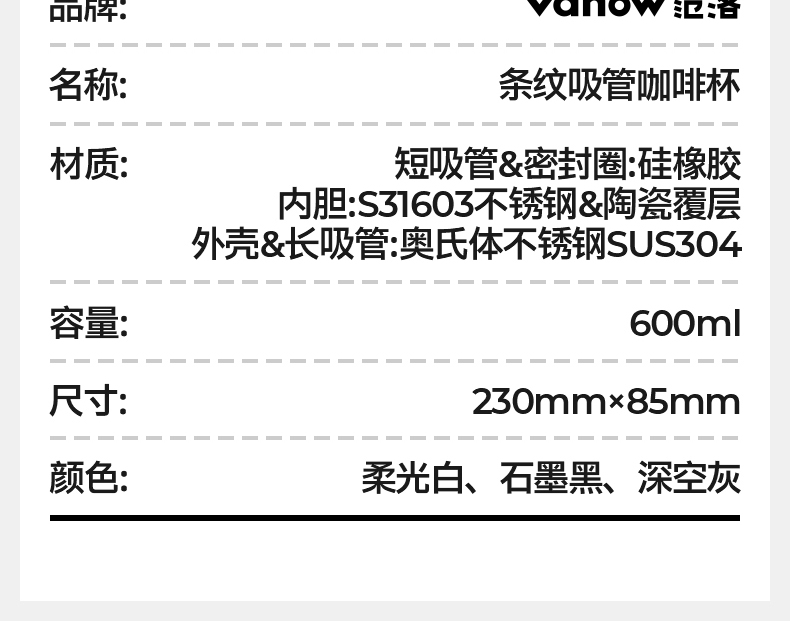 型号:VO-TW60XG 颜色:石墨黑,柔光白,深空灰 容量:600ml 尺寸:230*85mm 材质:316L不锈钢/pp材质/硅橡胶