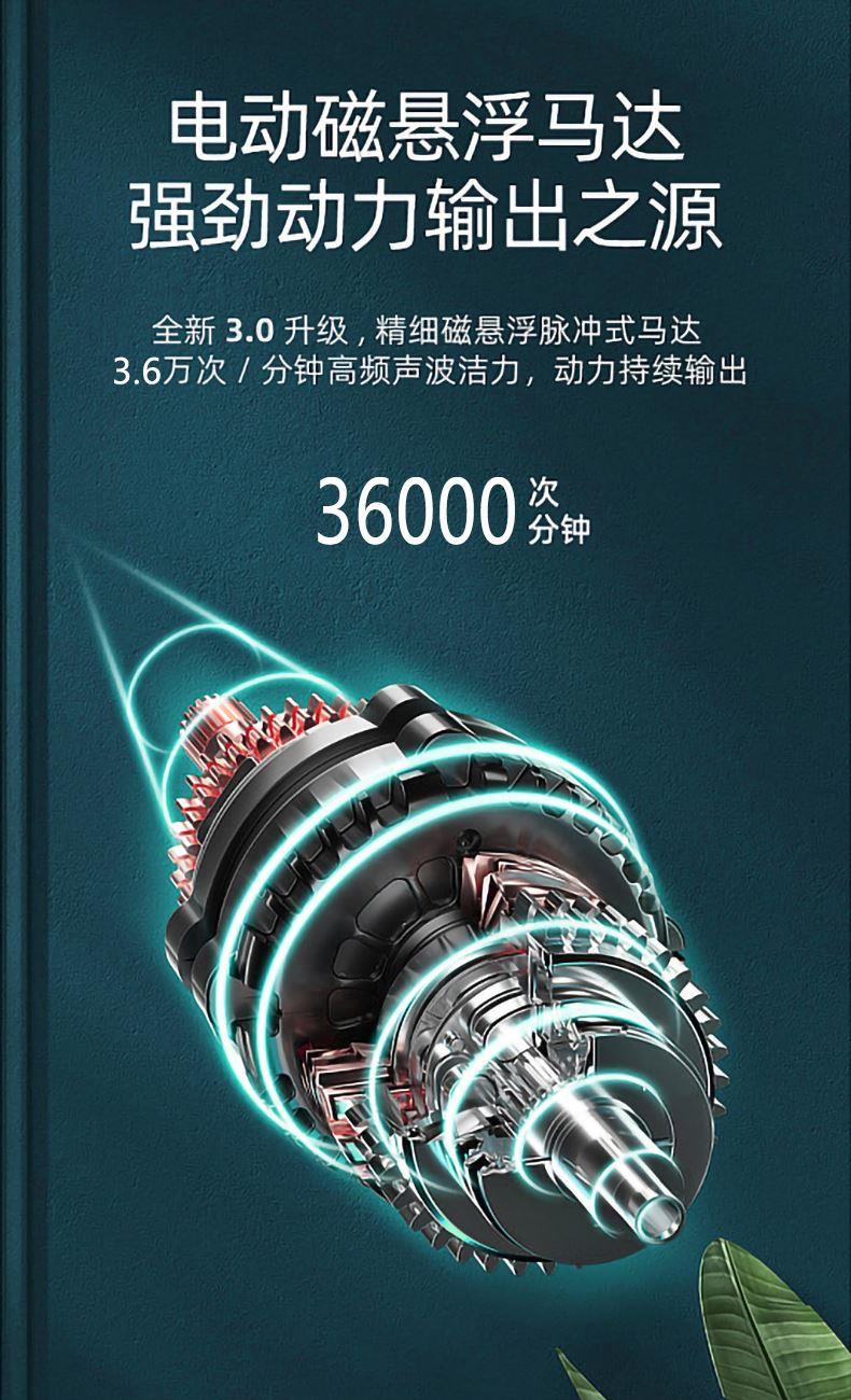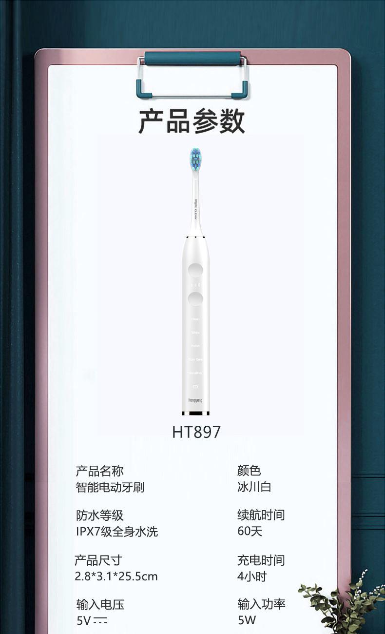 产品尺寸:28×31×255mm 彩盒尺寸:205×64×278mm 颜色:HT897白色 磁悬浮技术(升级版磁悬浮马达) 5档模式配合3速调节 Type-C充电接口, 4小时充电,放电时间≥60天 IPX7级全身水洗 30秒换区提醒 2分钟定时关机 杜邦高密度刷毛 2秒柔和起动