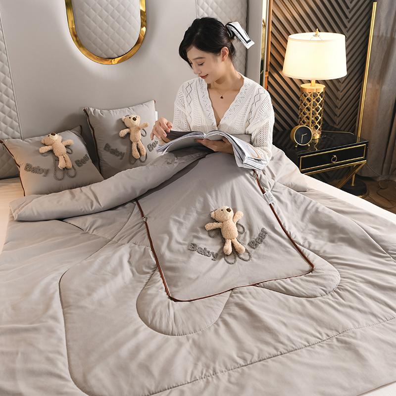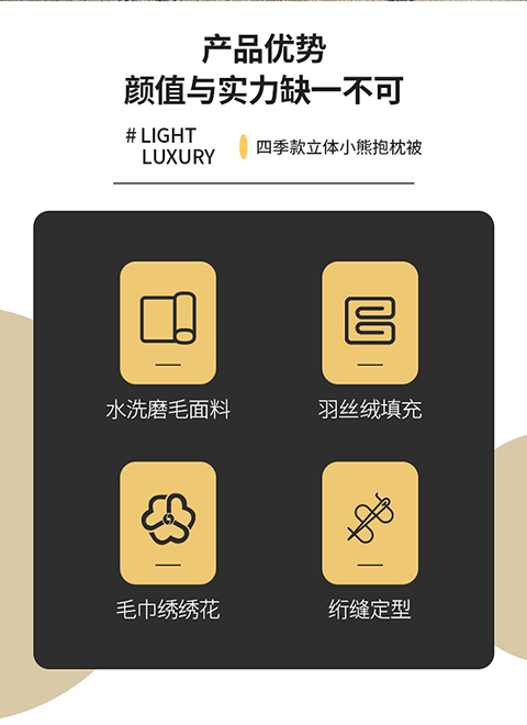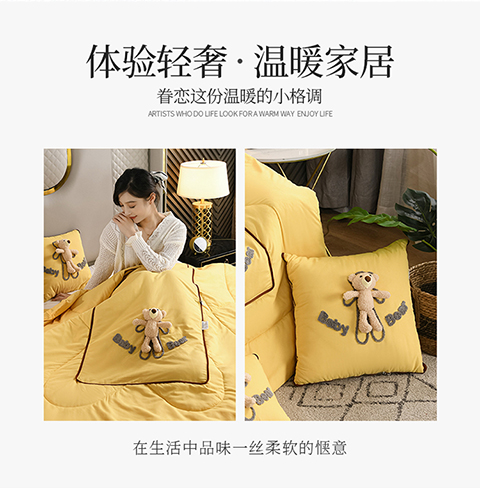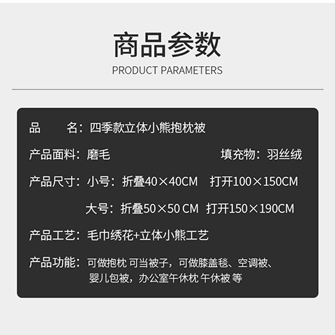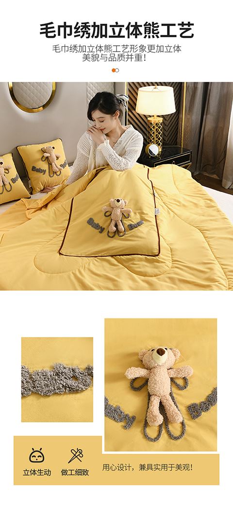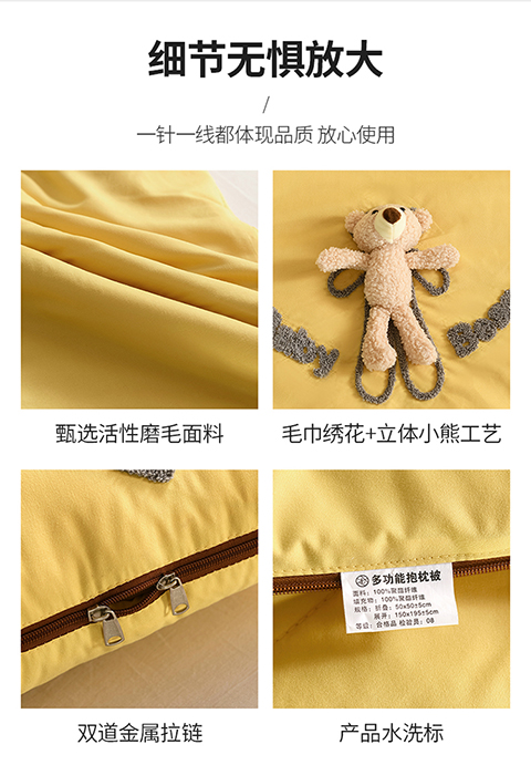 本品采用活性水洗磨毛面料+毛巾绣花+立体小熊工艺制作而成,活性水洗磨毛面料手感舒适,亲肤柔和,不褪色,不起球!毛巾绣加立体熊工艺形象更加立体,美貌与品质并重! 面料:水洗磨毛 工艺:毛巾绣花+立体小熊工艺 尺寸:40*40cm 打开110*150cm 面料:水洗磨毛 工艺:毛巾绣花+立体小熊工艺 尺寸:40*40cm 打开110*150cm