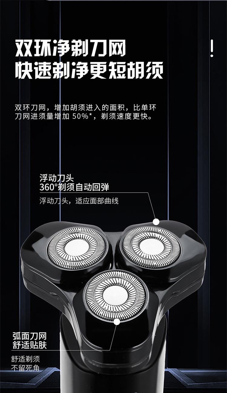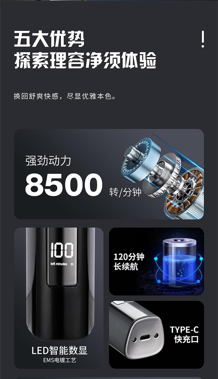 * 智能电量显示 * 长续航60天 * IPX7防水,可全身水洗 *智能旅行锁 * 符合人体工程学设计的流线型柔和机身 *磁吸式刀头设计 *8500转速
