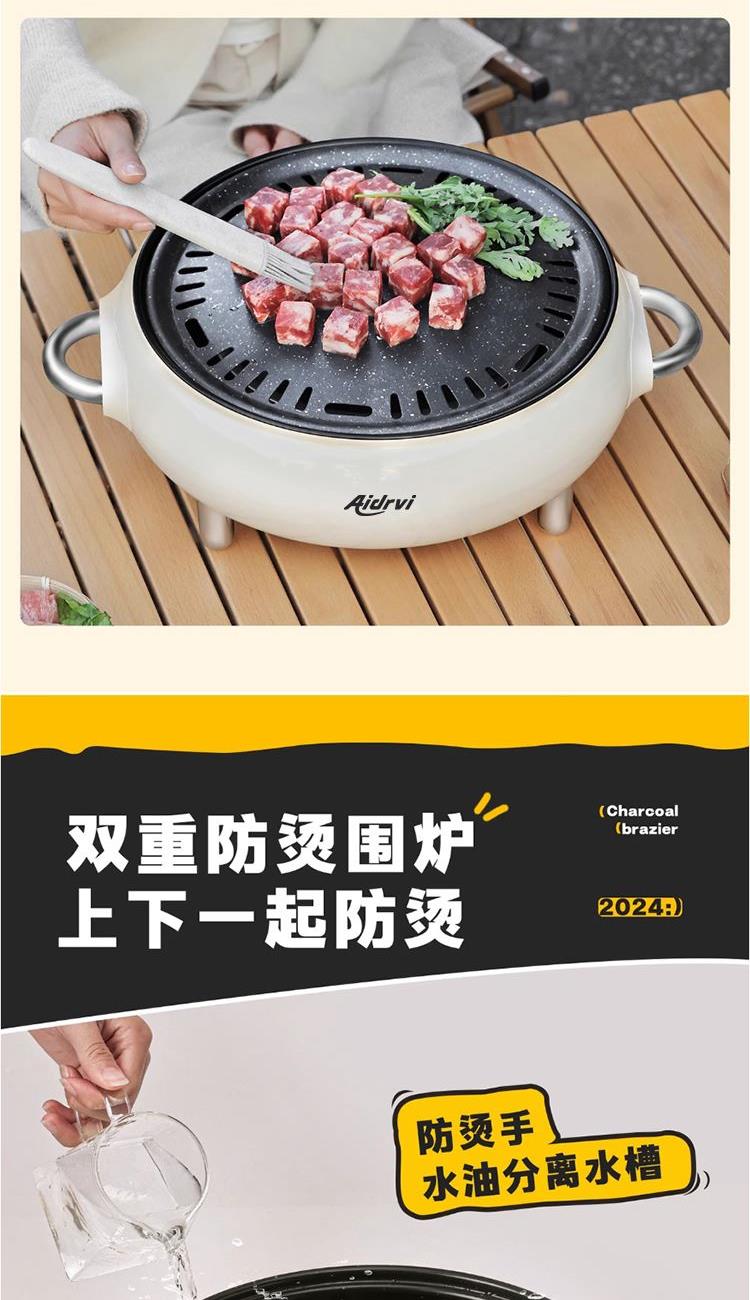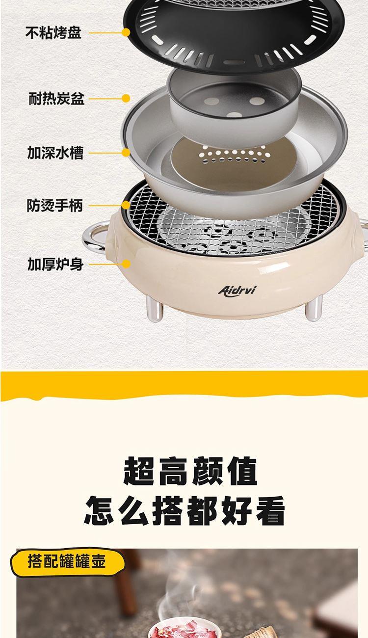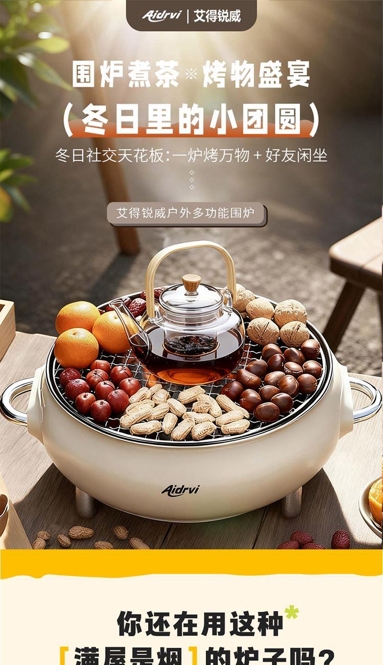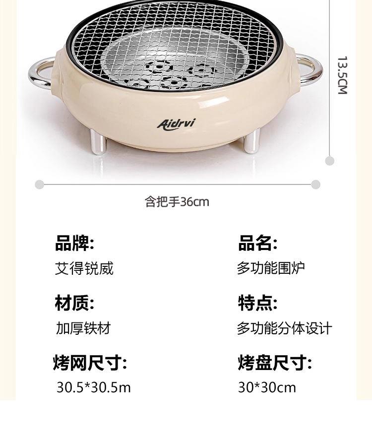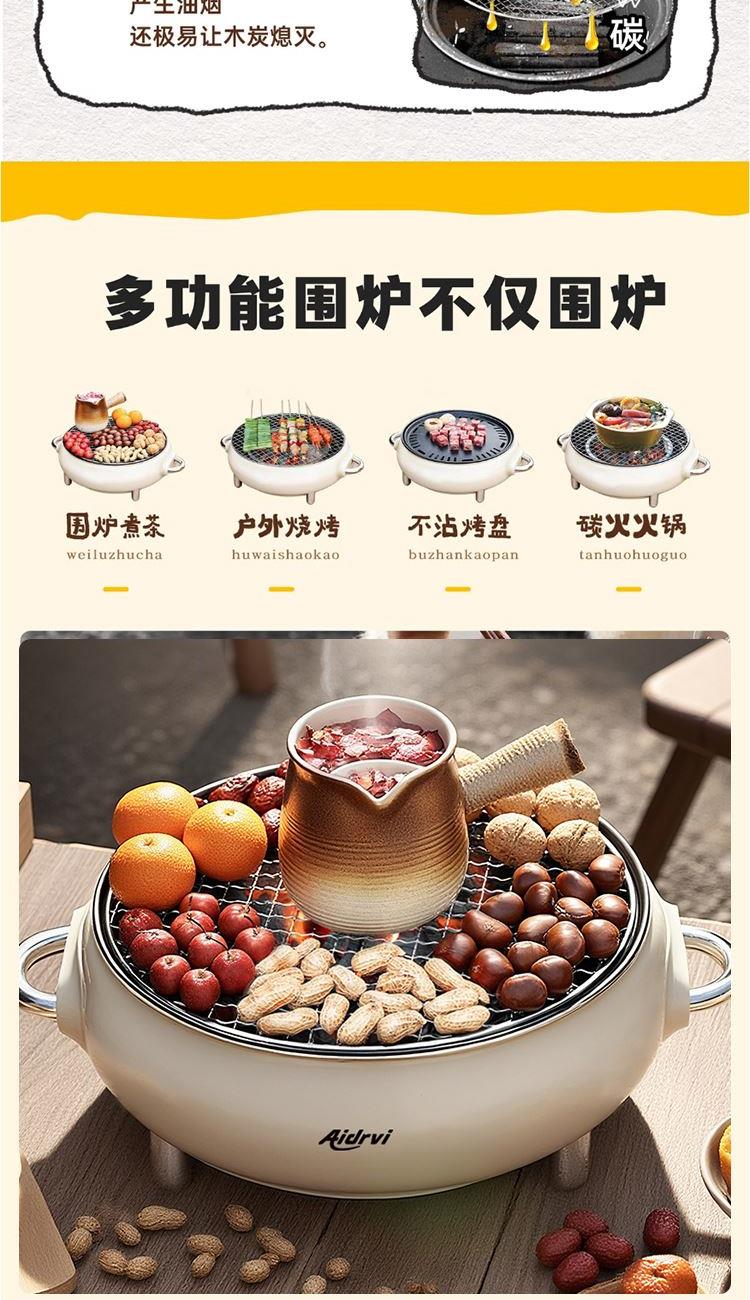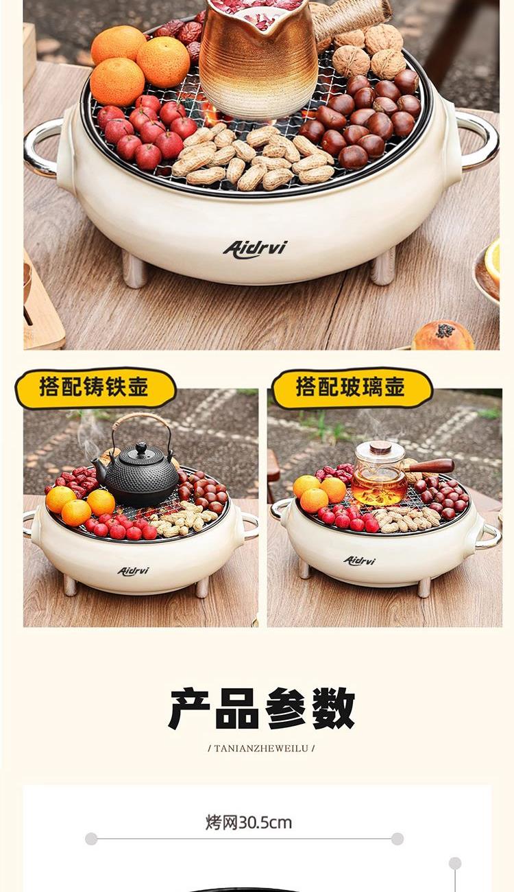套装组合:围炉+烤网+烤盘+提梁壶+收纳包 产品材质:加厚精铁+高硼硅玻璃 产品尺寸:围炉:36*13.5cm/提梁壶:1000ml 彩盒尺寸:58*16.5*36.2cm 外箱尺寸: 一炉多用,煮茶/煮酒/烧烤/取暖等满足更多需求; 一体成型加厚内胆,坚固耐用; 方格加密烤网,食物不易落下; 不粘烤盘受热均匀,导热快/耐腐蚀/易清洗; 分体设计,全身可水洗,省心省力,更卫生; 配备提梁煮茶壶,好友好茶配好器;