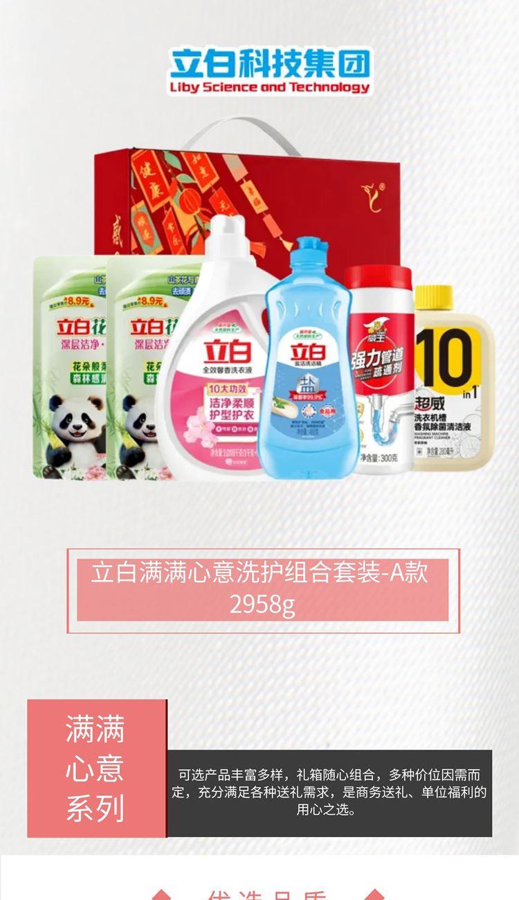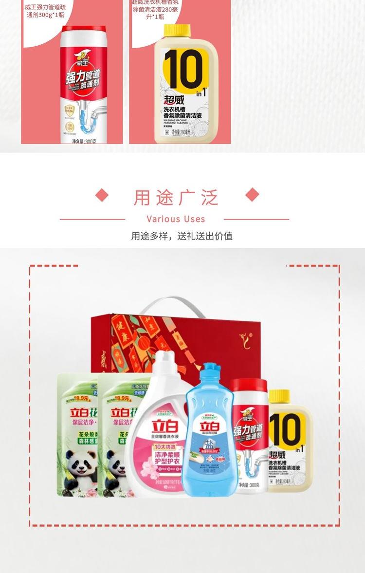 配置: 立白全效馨香洗衣液1.018kg*1瓶 立白花植柔护深层洁净天然洗衣液450克*2袋 立白盐洁洗洁精460g*1瓶 超威洗衣机槽香氛清洁液280毫升*1瓶 威王强力管道疏通剂300g*1瓶 核心卖点: 可选产品丰富多样,礼箱随心组合,多种价位因需而定,充分满足各种送礼需求,是商务送礼、单位福利的用心之选。