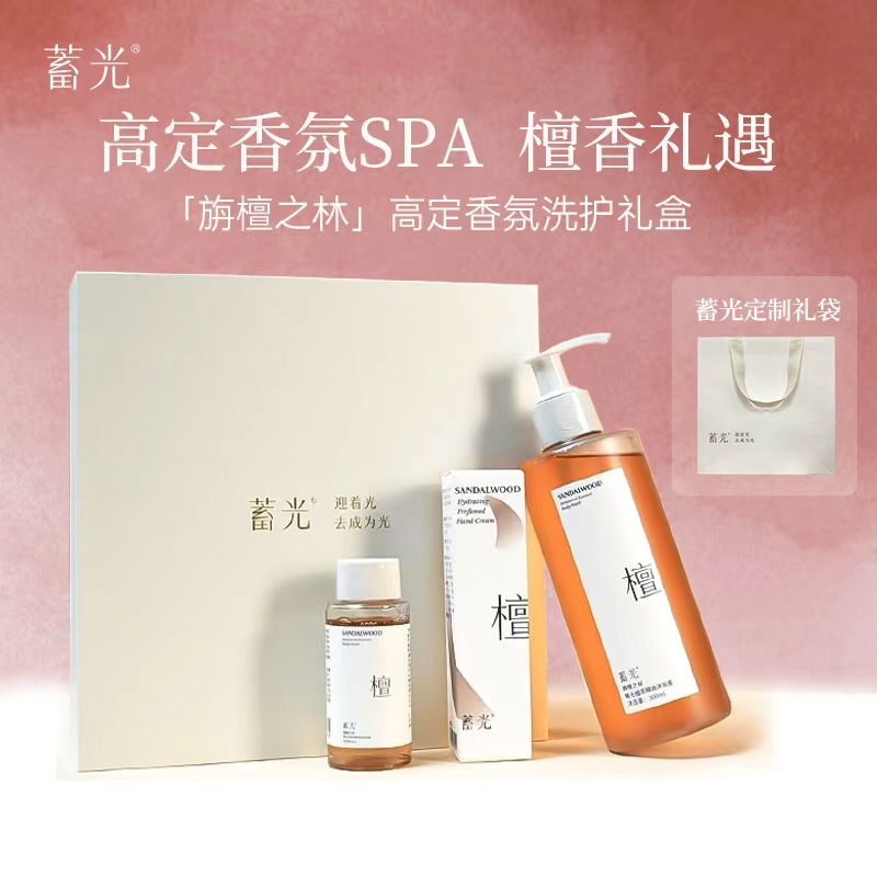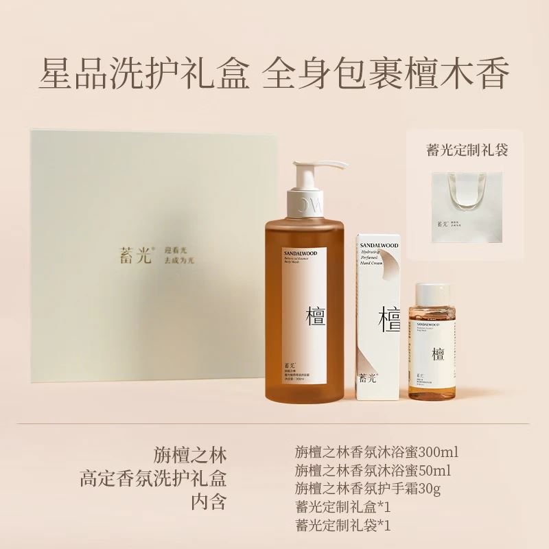 礼赠限定礼盒A款(小号) 蓄光-礼品袋(大) 蓄光-植萃精油沐浴蜜(旃檀之林)300ml 蓄光-植萃精油沐浴蜜(旃檀之林) 50ml 蓄光-植萃润养护手霜(旃檀之林)30g
