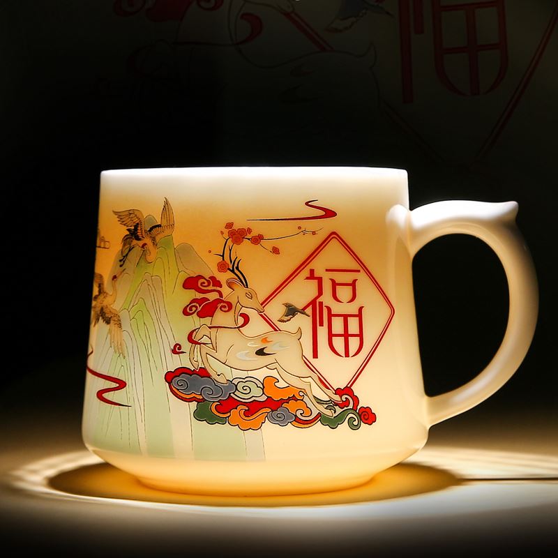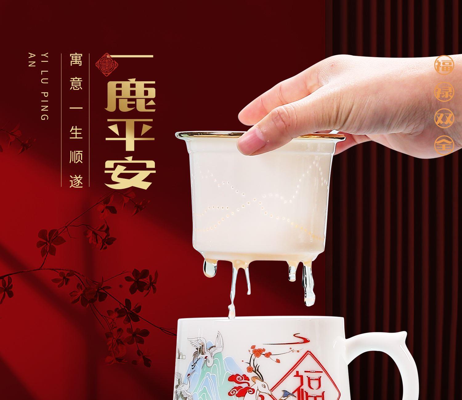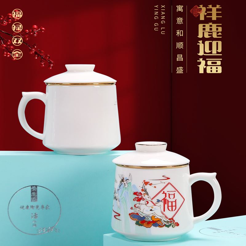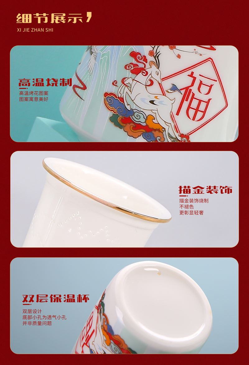 配 制: 1杯 1盖1过滤 1保温杯 1礼盒手提袋 规格:办公杯:13.5*12cm 双层保温杯:17.5*7cm 材质:羊脂玉瓷 描24K真金 亚克力木盖 工艺:羊脂玉瓷茶具,描金装饰,做工精致。仙鹿与福同行,寓意福禄吉祥。杯身可定制图案LOGO,盖顶可激光雕刻。