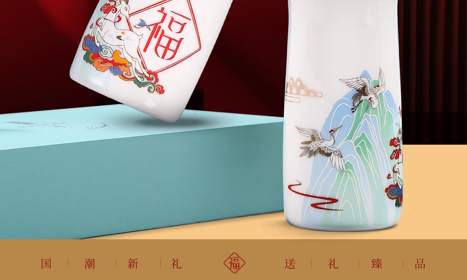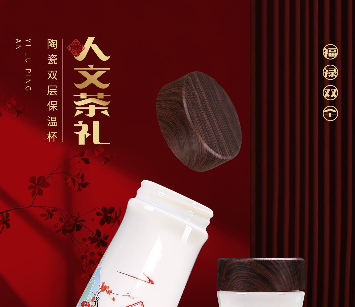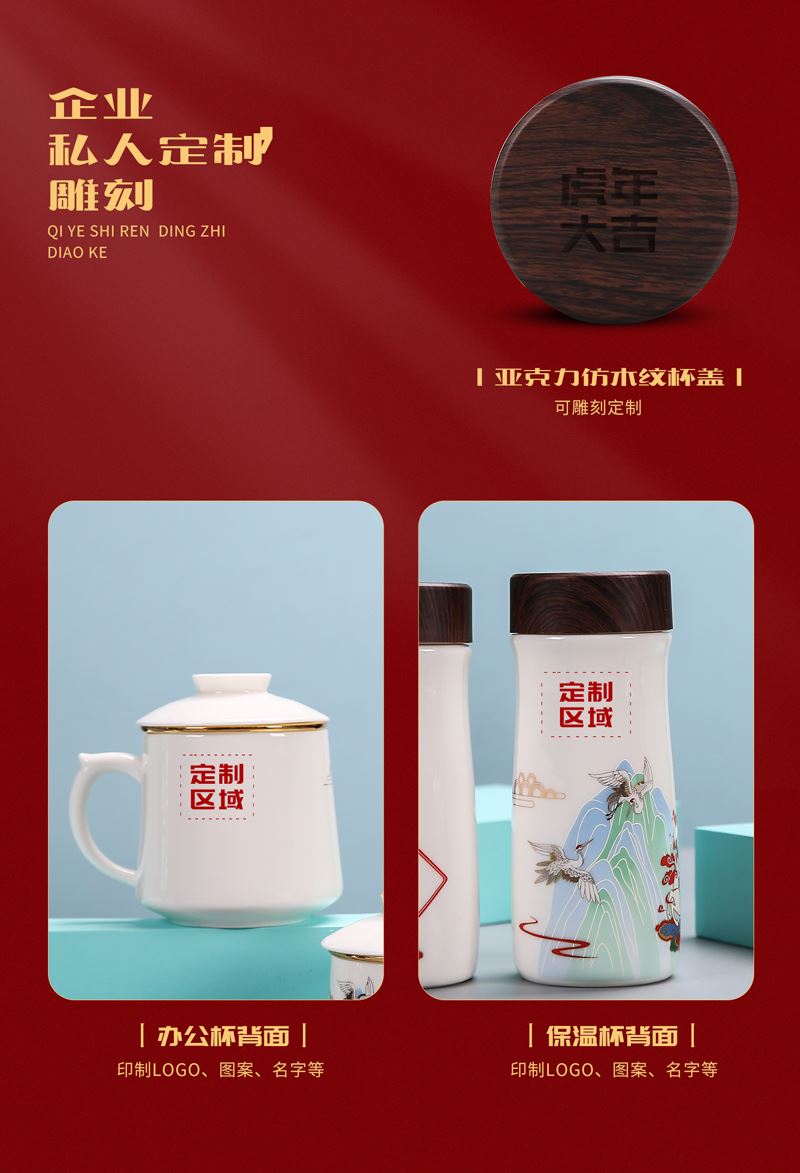 配 制: 1杯 1盖1过滤 1保温杯 1礼盒手提袋 规格:办公杯:13.5*12cm 双层保温杯:17.5*7cm 材质:羊脂玉瓷 描24K真金 亚克力木盖 工艺:羊脂玉瓷茶具,描金装饰,做工精致。仙鹿与福同行,寓意福禄吉祥。杯身可定制图案LOGO,盖顶可激光雕刻。