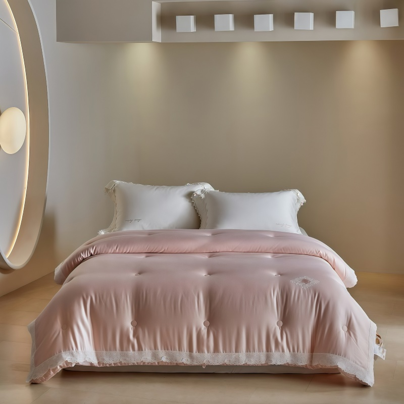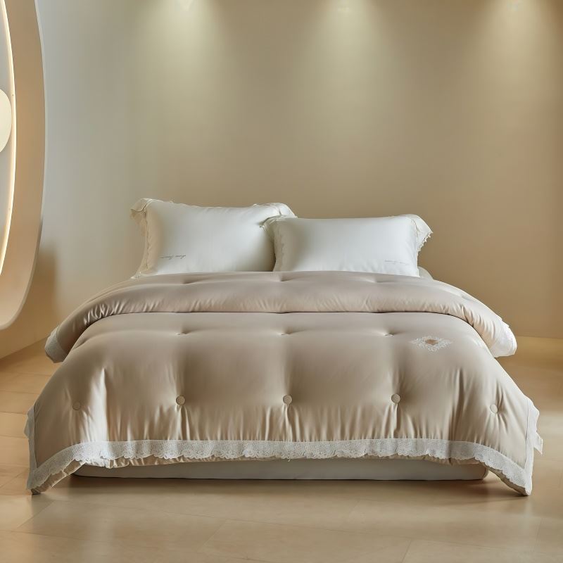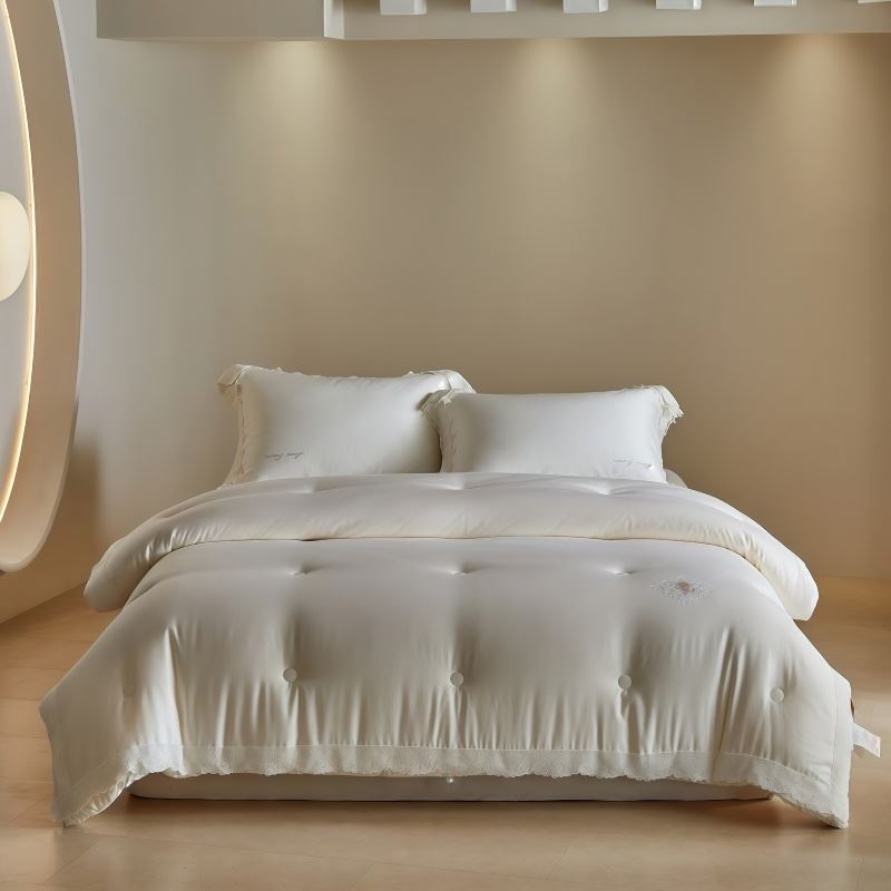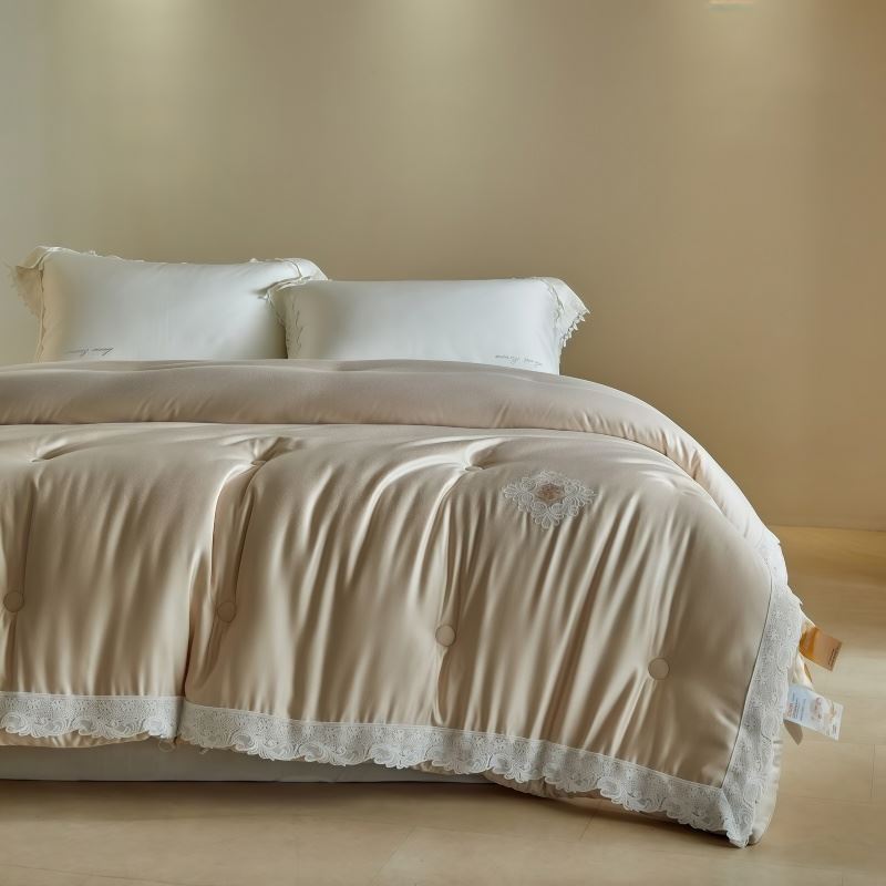 填充:上层:黄金桑蚕丝,桑蚕丝是天然动物蛋白纤维,触感柔软、亲肤透气,常为轻奢床品填充,能提升舒适度与品质 。