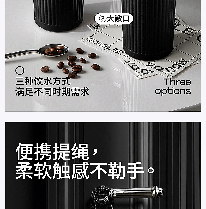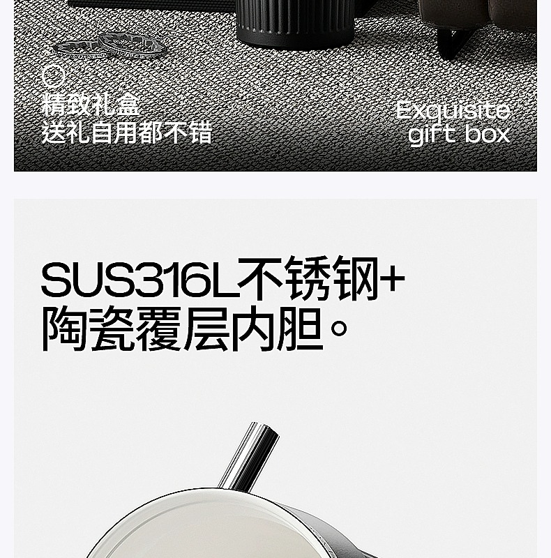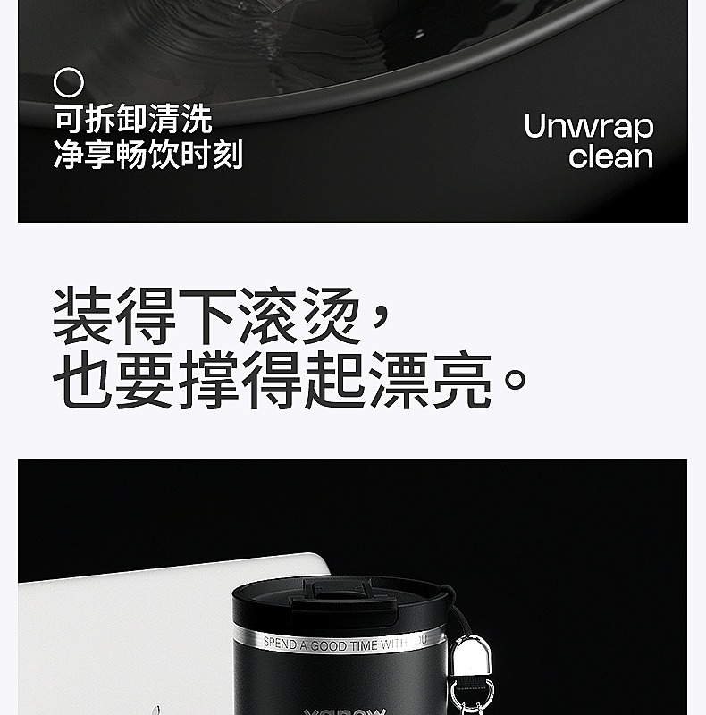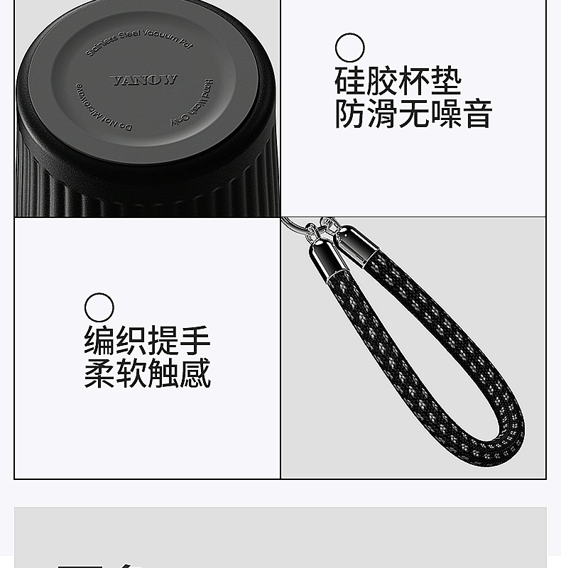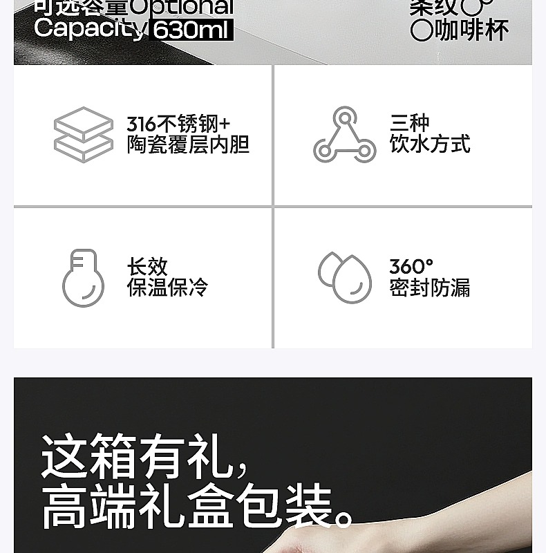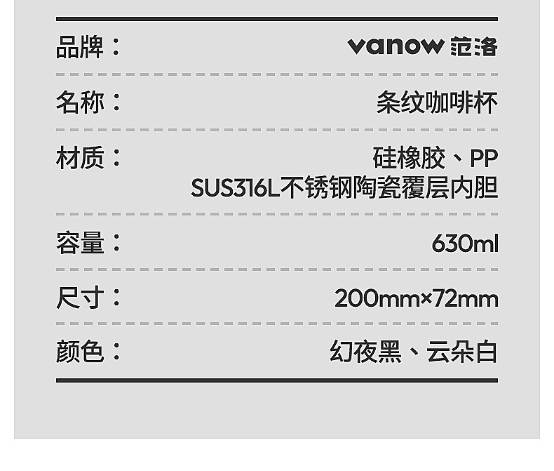型号:VO-TW63CF-C 颜色:幻夜黑,云朵白 容量:630ml 尺寸:200*72mm 材质:316不锈钢陶瓷覆层内胆,硅橡胶,pp