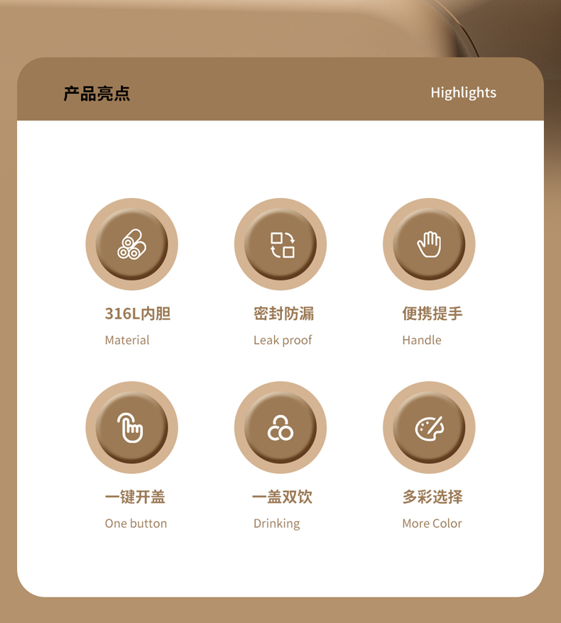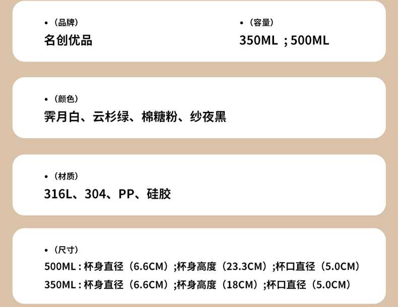 容量:350ml 颜色:黑、白、粉、绿 杯身主体材质:304不锈钢 杯盖材质:pp 功能:一键速开,双饮 内胆材质: 316L不锈钢 杯身样式: 直身杯 杯盖样式 :弹盖 包装:彩盒 (偏远地区在常规代发价基础上,新疆西藏+12元,海内青甘宁+5元)