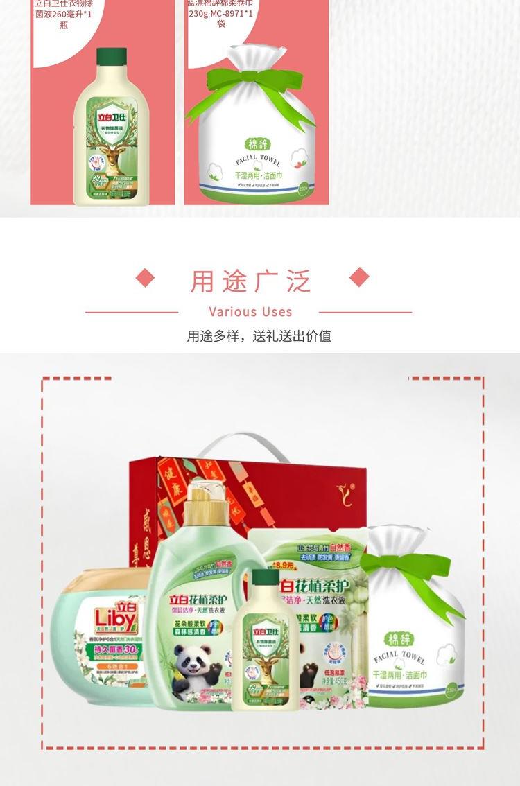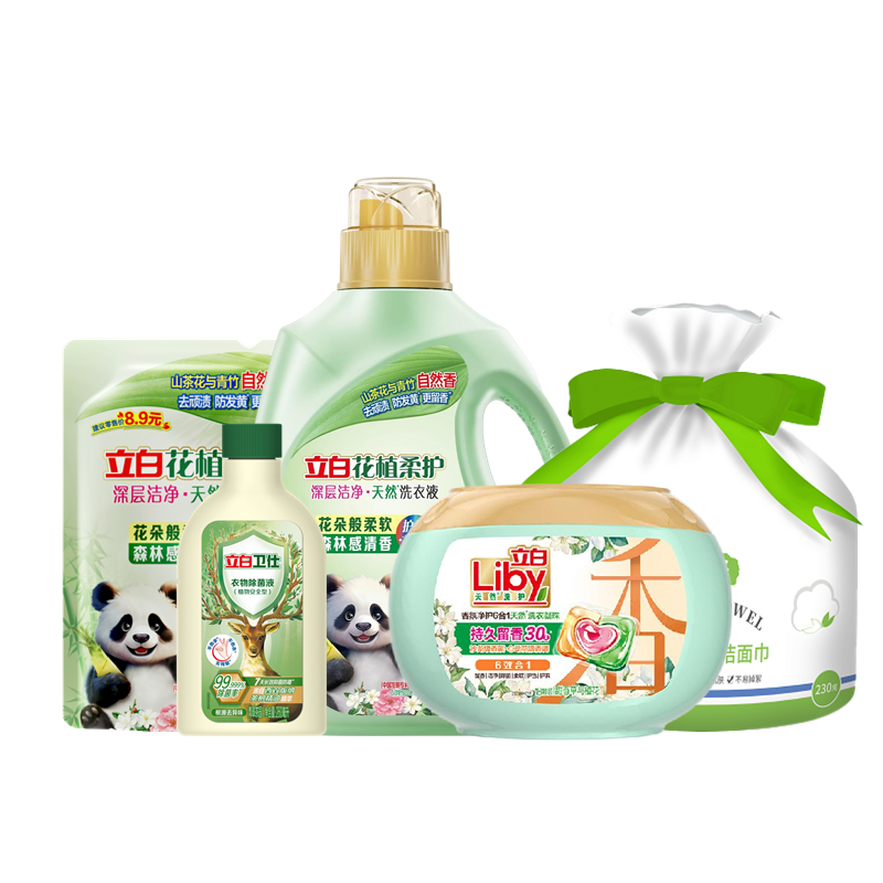 配置: 立白花植时代天然护衣护色洗衣液2千克*1瓶 立白花植柔护深层洁净天然洗衣液450克*1袋 立白香氛净护6合1天然洗衣凝珠180克(18颗)*1盒 立白卫仕衣物除 菌液260毫升*1瓶 蓝漂棉辞棉柔卷巾 230g MC-8971*1袋 核心卖点: 可选产品丰富多样,礼箱随心组合,多种价位因需而定,充分满足各种送礼需求,是商务送礼、单位福利的用心之选。