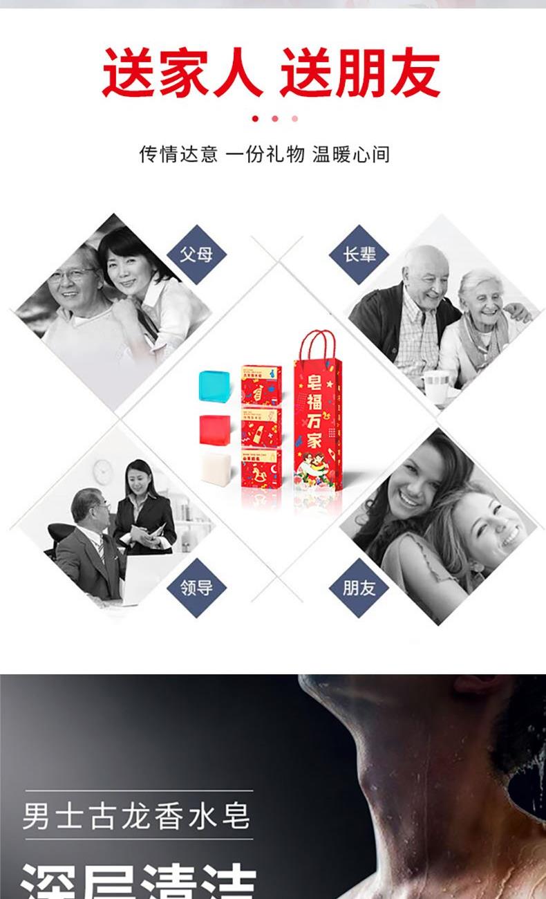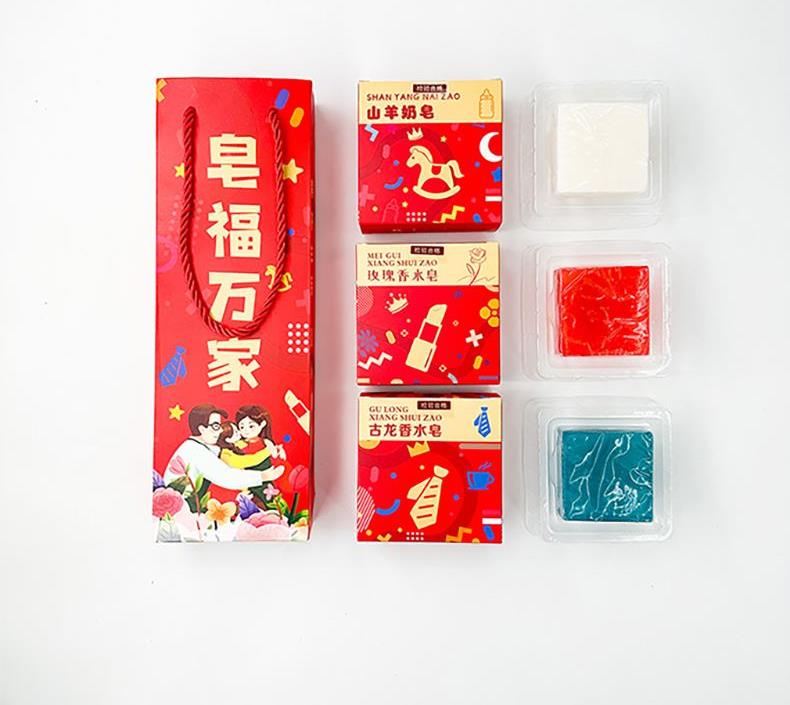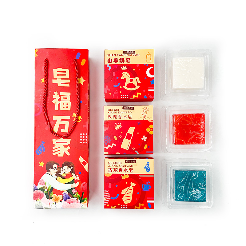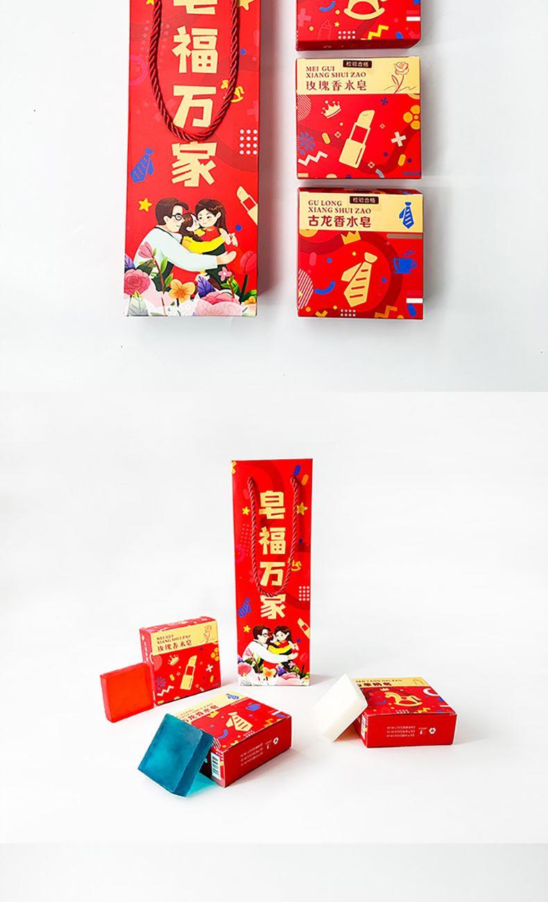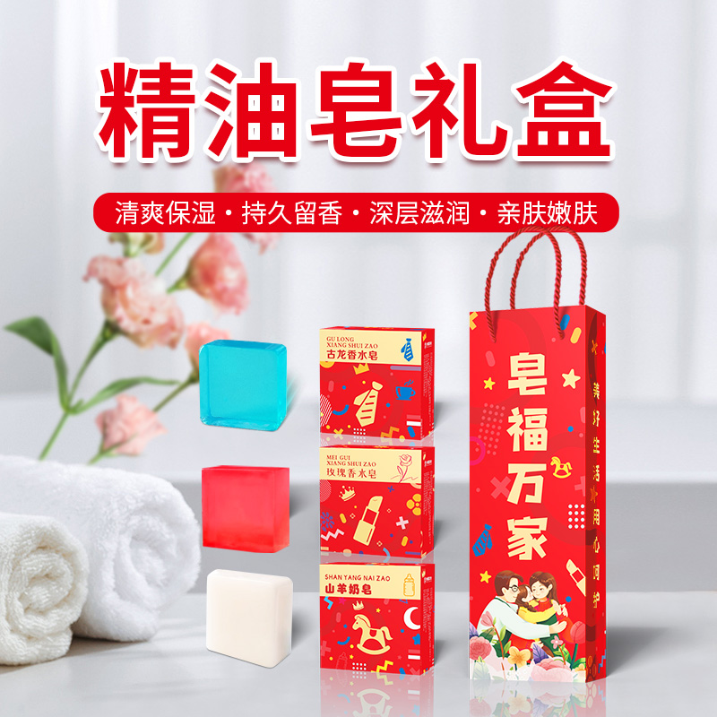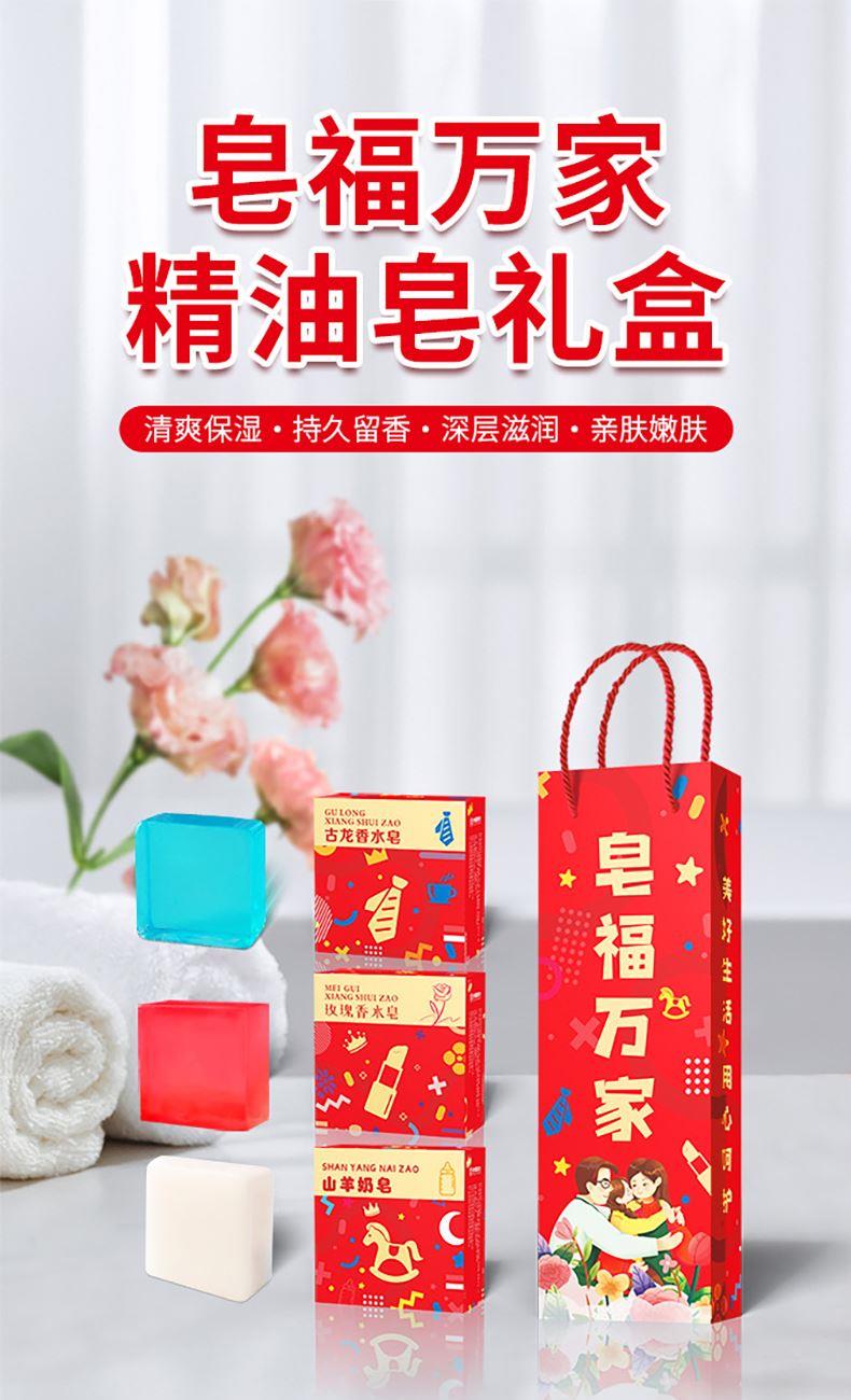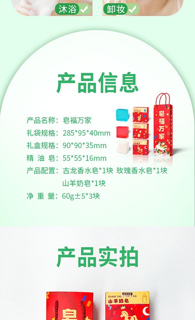 产品主题:美好生活 用心呵护 礼袋规格:120*80*280mm 精油皂:55*55*16mm 产品配置:古龙香水皂*1块 玫瑰香水皂*1块 山羊奶皂*1块 产品卖点: 1、皂福万家,谐音造福万家,寓意好。 2、产品由三块手工精油皂组成,分别是男士古龙香水皂、女士玫瑰香水皂和儿童山羊奶皂,一套满足全家需求。 3、天然草本,手工低温冷制皂,更好的皂,给家人更好的保护。 4、精油皂可洗手、洗脸、沐浴、洗衣,家家必备,人人需要。