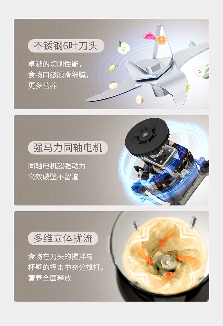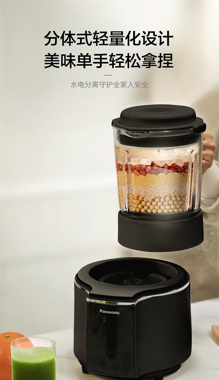 颜色:黑色 尺寸:长233 x 宽201 x 高385mm 容积:冷饮上限:1.2L 热饮上限:1L 功率:加热:800W 搅拌:450W 净重:4.7kg 五重柔音降噪技术,从声音源头处减少震动降低噪音,由内而外层层守护愉悦体验 陶瓷涂层技术,遇热不易糊底,食渣不易粘黏,洗后不易残留水渍,不易刮花/刮伤 高温加热式深度自清 5.7英寸超大彩屏 玩味11种自动菜单 12H智能预约,10档速度控制 分体式轻量化设计 美味单手 轻松拿捏