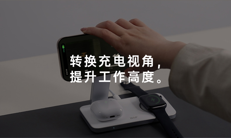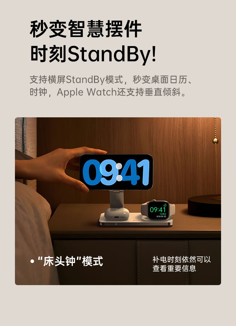 15W无线充电 同时为手机/苹果手表/耳机三部设备充电 小巧便携折叠设计 可升降支架,提高手机充电角度